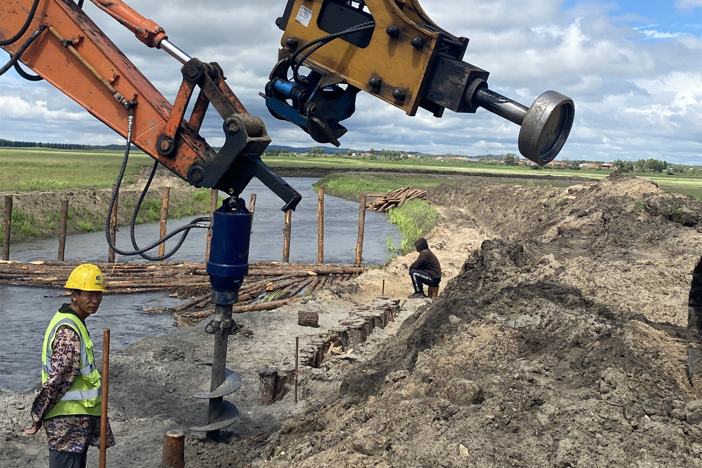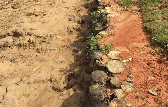改造魚塘,堤壩用木樁加固為了穩(wěn)定壩的基礎,兩邊用松木樁固定;相對來說木樁成本較低。